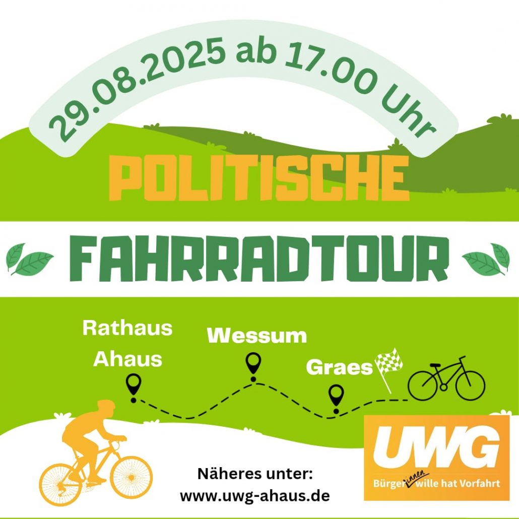 Die UWG Ahaus setzt sich aufs Fahrrad. Am Freitag 29. August 2025 um 17:00 geht es am Rathaus in Ahaus ...