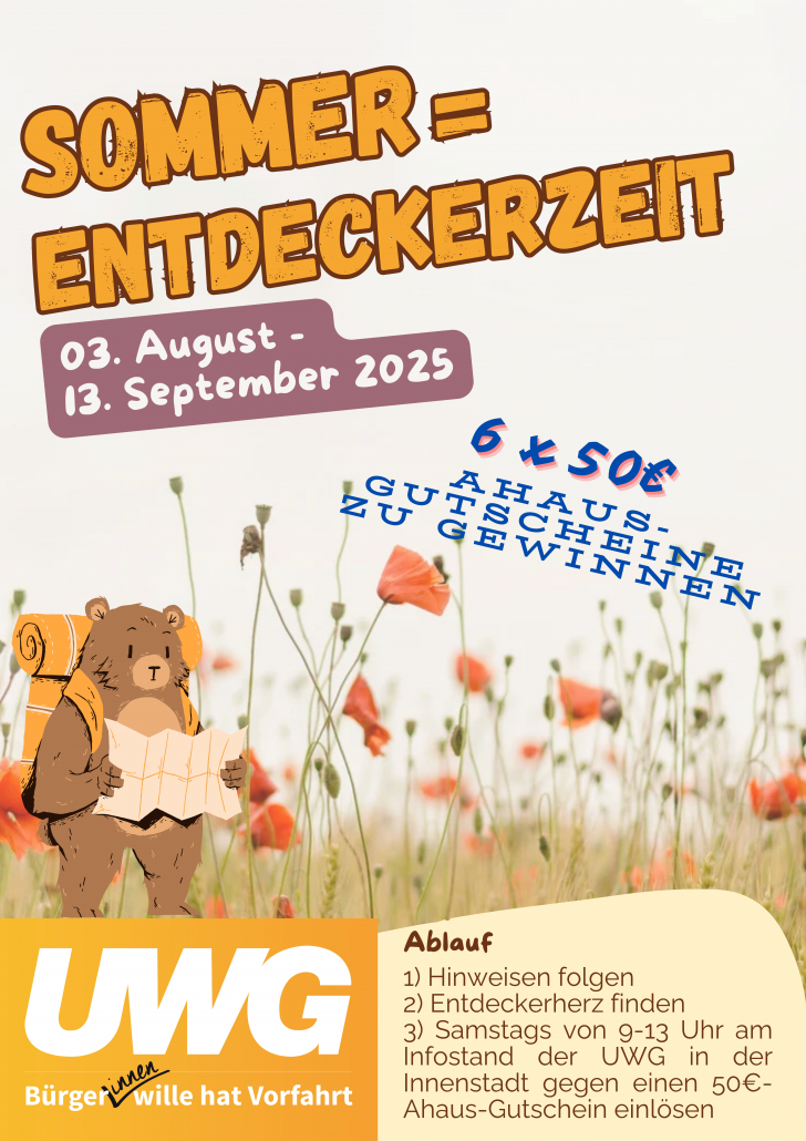 Sommerzeit ist Entdeckerzeit! Ihr könnt einen von sechs 50€-Gutscheinen gewinnen! Die UWG versüßt den Sommer mit einer besonderen Entdecker-Aktion und ...